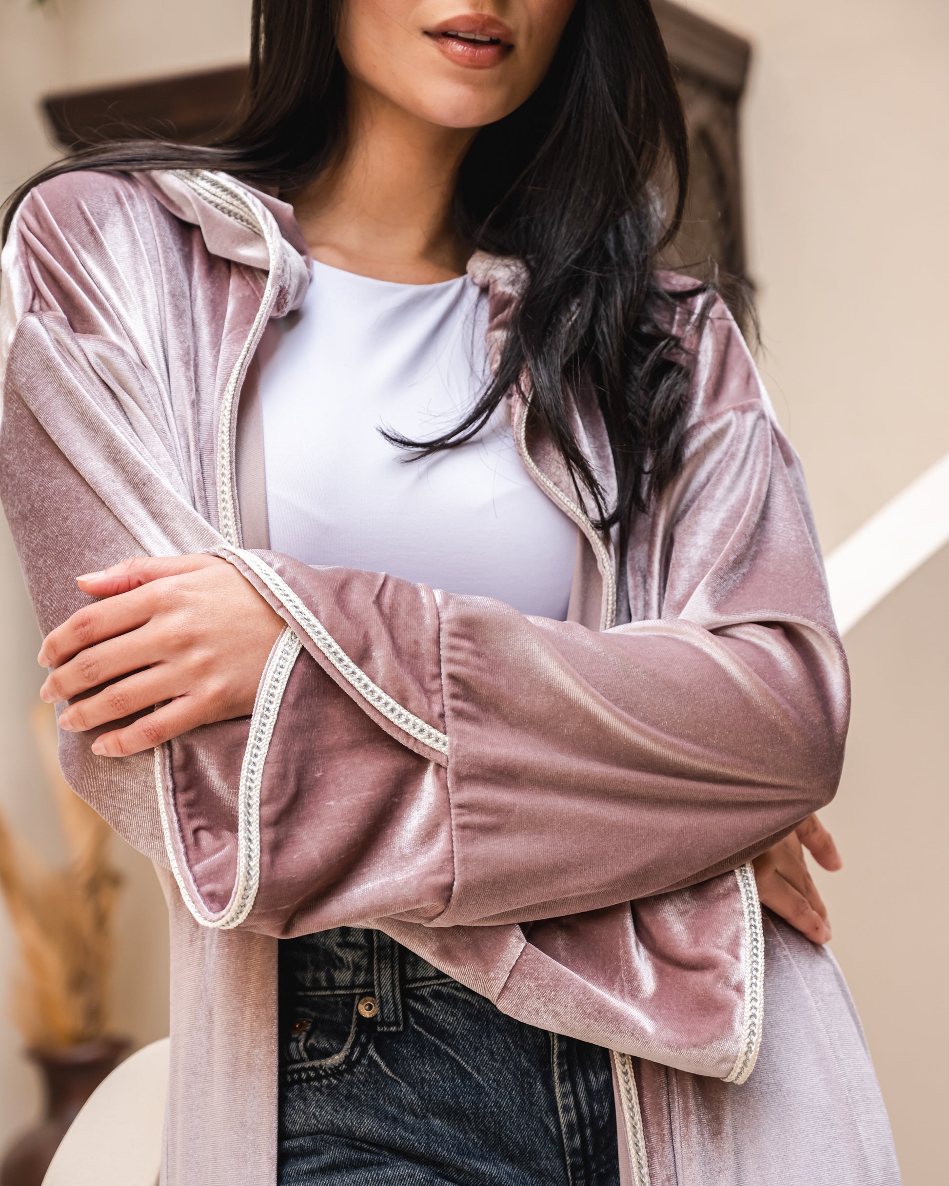 Soft velvet kaftan with light gold details.
